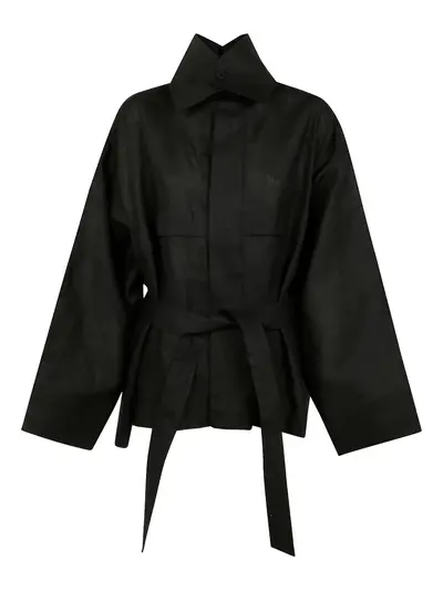 black concealed front button fastening adjustable wait belt double collar drop shoulder