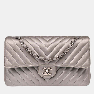 Chanel Silver Calfskin Chevron Medium Classic Double Flap Shoulder Bag 1134593 (lpn29642541)