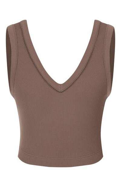 Укороченную майку выполнили из эластичного хлопкового трикотажа в рубчик. Глубокие V-образные вырезы модели украсили отделкой из цепочки мониль.