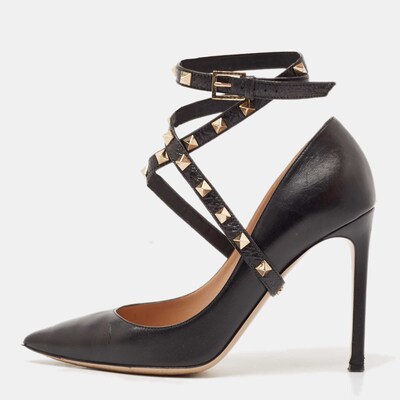 Valentino’s Rockstud pumps feature a wraparound ankle strap and pointed toe for sharp sophistication. The black leather base makes them perfect for evening events, while the studs add edgy flair. Wear with fitted dresses or leather separates to turn up the drama.