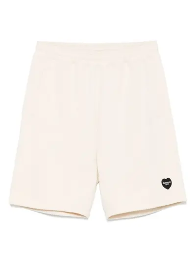 light beige elasticated waistband with internal drawstring two side welt pockets logo patch to the front rear patch pocket