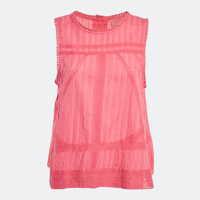 Elevate your casual wardrobe with this exquisite sleeveless top crafted by Zadig and Voltaire. Made entirely from premium cotton, it offers both breathability and style. The soft pink hue is perfectly complemented by delicate lace trimming, adding a touch of femininity and elegance. This top seamlessly blends luxury with laid back vibes, making it ideal for any fashion forward woman seeking a unique yet versatile piece to enhance her collection.