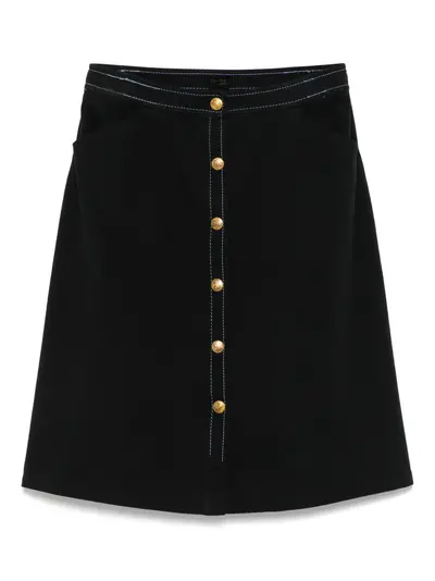 circa 1970s black cotton twill weave two side slit pockets front press-stud fastening embossed gold-tone buttons contrast stitching unlined straight hem Condition: GOOD. This previously owned and used item is in good condition with minimal signs of use. This may include fading of material or plating and scratches.