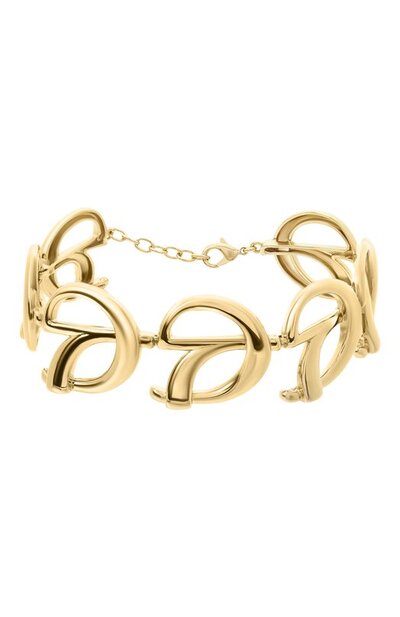 Широкое ожерелье с крупными звеньями в виде фирменной монограммы выполнили из латуни с гальваническим покрытием золотом. Посадку аксессуара регулирует ажурная цепочка с карабином.
