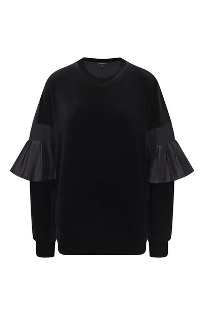 Свитшот свободного кроя выполнили из блестящего полиэстерового бархата. Рукава декорировали широкими объемными оборками из гладкого атласа.