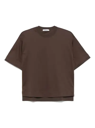 chocolate brown embroidered logo at the sleeve short side slits crew neck short sleeves
