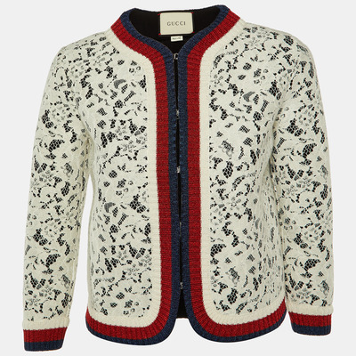 This Gucci lace jacket brings romantic detailing with a modern edge. Featuring a white lace body and signature web trim with lurex threads, it’s a statement piece for dressy or casual looks. Wear it over a slip dress or pair with denim for a luxe contrast.