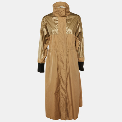 This brown long coat by Moncler offers lightweight insulation with a metallic bronze finish. Designed for cool weather style, its both functional and fashion forward—ideal for layering over sleek casuals.
