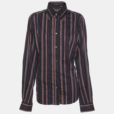 Immerse yourself in the sophisticated allure of a shirt where purple stripes elegantly intertwine on a navy canvas. Crafted by Dolce and Gabbana, this exquisite piece merges the finest cotton blend, ensuring both comfort and a graceful fit. The buttoned closure adds a classic touch, perfect for casual occasions that demand a hint of luxury. This blend promises to become a staple in a fashion forward wardrobe.