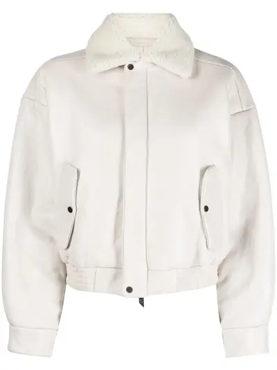 ivory white calf leather logo plaque shearling collar front press-stud and zip fastening drop shoulder long sleeves press-stud fastening cuffs two press-stud fastening pockets elasticated waistband