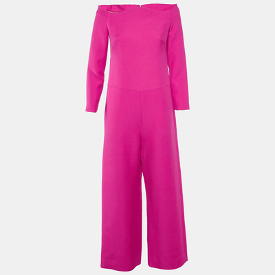 This off shoulder pink jumpsuit by Valentino offers an ultra feminine silhouette in a soft wool blend. Ideal for dressy events, it exudes modern glamour with its sculptural lines and flattering cut.