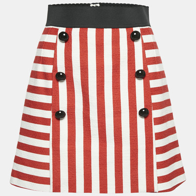Playful yet polished, this Dolce and Gabbana mini skirt is crafted from slub cotton with bold red piping and statement buttons. The flirty silhouette and crisp color contrast make it ideal for sunny weekends or brunch with a stylish twist.