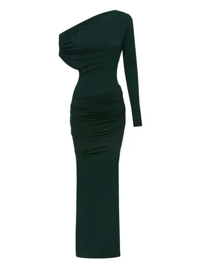 dark green concealed side zip fastening one-shoulder single long sleeve single short sleeve
