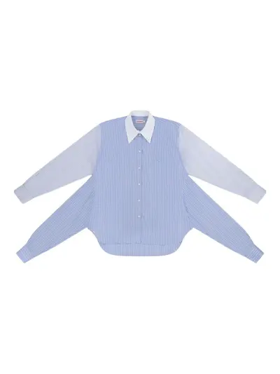 light blue button-up design contrasting striped sleeves oversized collar tied detailing logo embroidery