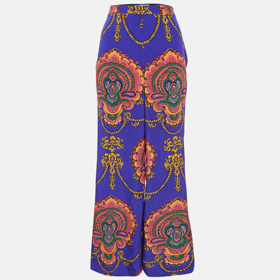 These wide leg silk trousers from Gucci feature vibrant prints on purple, adding a pop of color to your wardrobe.