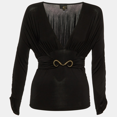 Just Cavalli Black Jersey Gathered Brooch Detail V-Neck Top M 1145595 - 1