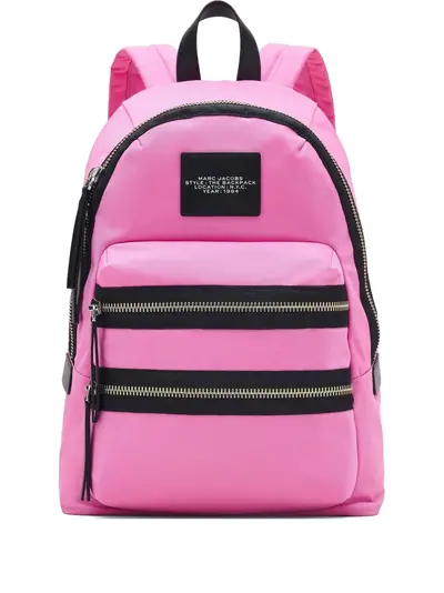 hot pink dual zip compartments logo patch detail adjustable shoulder straps top handle tonal zip pulls