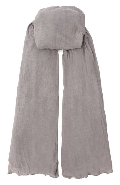 Шарф выполнили из вискозного трикотажа с жатой фактурой. Аксессуар окрасили так, чтобы получить слегка неравномерный оттенок, будто выгоревший со временем.