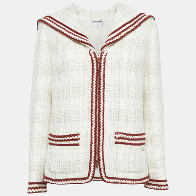 Textured and light, this authentic Chanel womens jacket in white fantasy tweed is a fresh take on a house staple. It wears just as well layered with denim as it does with classic trousers.