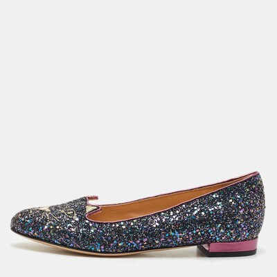 Charlotte Olympia’s signature feline motif takes a dazzling turn with these multicolor glitter ballet flats. The embroidered cat face adds a hint of mischief, while the rainbow shimmer delivers standout charm. Pair them with solid separates to let the shoes steal the scene. Cute, quirky, and unmissable—these flats are pure personality.