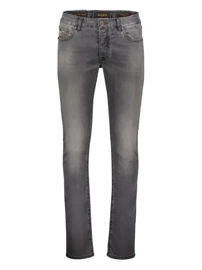 medium grey concealed fly and button fastening belt loops classic five pockets logo patch to the rear