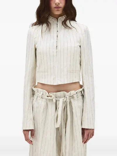 light beige front hook and eye fastening vertical stripe pattern two front jetted pockets long sleeves
