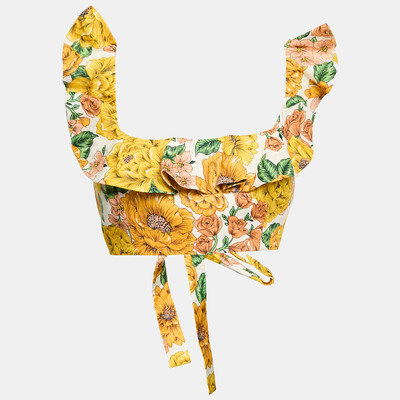 Zimmermann’s crop top is printed with vivid yellow poppy florals on breathable linen, designed with a flattering tie front and puffed sleeves. It’s playful yet polished—ideal for sun drenched days, seaside escapes, or statement layering. Pair with high waisted separates and minimal accessories for effortless resort dressing with character.