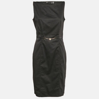 Embrace effortless elegance with this Love Moschino black dress. Crafted from a cotton blend, it offers a soft feel and slight stretch for all day comfort. The standout feature is the chic metal embellishment at the waist, adding a touch of glamour. Designed with a convenient zip closure, this dress combines practicality with style. Its classic black hue ensures it pairs beautifully with accessories.