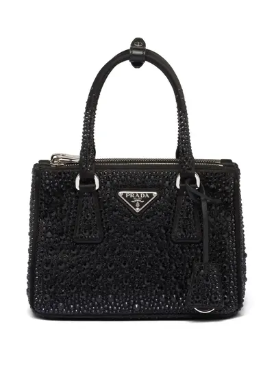 black silk satin crystal embellishment enamel triangle logo silver-tone hardware two rolled top handles adjustable detachable shoulder strap top zip fastening partitioned compartment