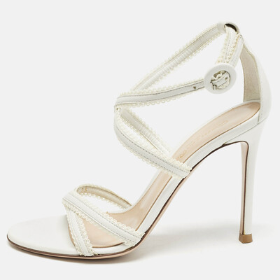 These pre loved Gianvito Rossi heels are crafted in white leather with delicate scalloped lace edges. The ankle strap adds a graceful touch, perfect for light, dressy moments.