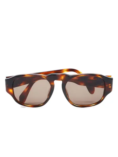 circa 1990-2000s acetate Havana brown UV-protective lenses curved arms logo plaque at the arm signature interlocking CC logo These glasses come with a protective case. Condition: GOOD. This previously owned and used item is in good condition with minimal signs of use. This may include fading of material or plating and scratches.