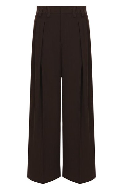 Широкие брюки с глубокими парными складками и заниженной линией шага выполнили из ткани на основе вискозы и шелка. Модель со шлевками для ремня на поясе дополнили боковыми и прорезными задними карманами.