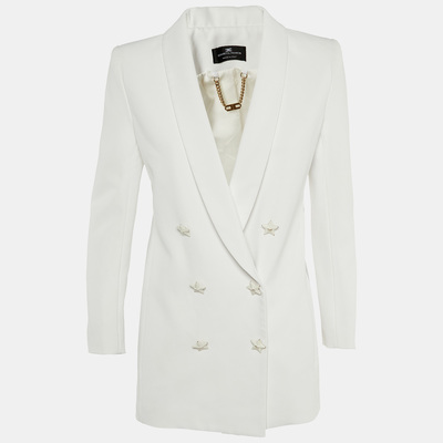 Tailored in crisp white crepe, this double breasted blazer by Elisabetta Franchi is elevated with star shaped buttons. Clean lines and sharp shoulders give it a structured, modern feel.
