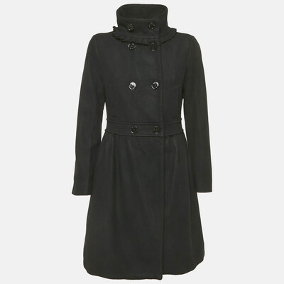 Classic tailoring meets playful charm in this Love Moschino black wool coat. Designed with a sharp double breasted front and structured silhouette, it’s elevated by feminine ruffle detailing that adds a touch of whimsy to its timeless elegance.