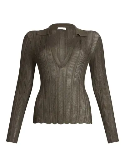 olive green plunging V-neck long sleeves scallop hem