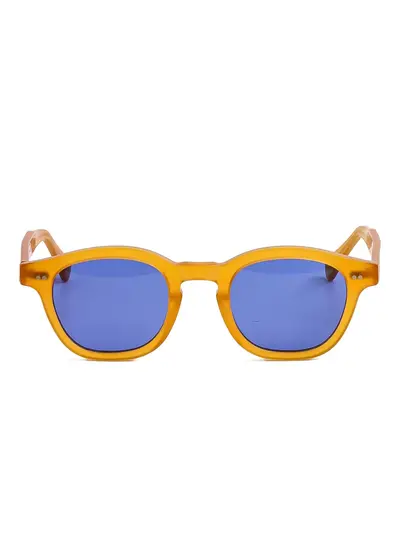golden brown square frame blue tinted lenses sleek arms logo detailing on temples