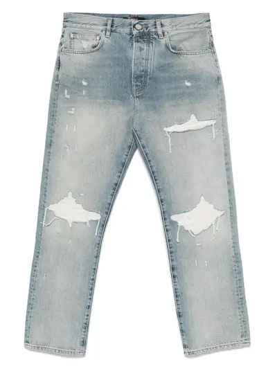 light blue front button fastening classic five pockets logo patch to the rear ripped detailing