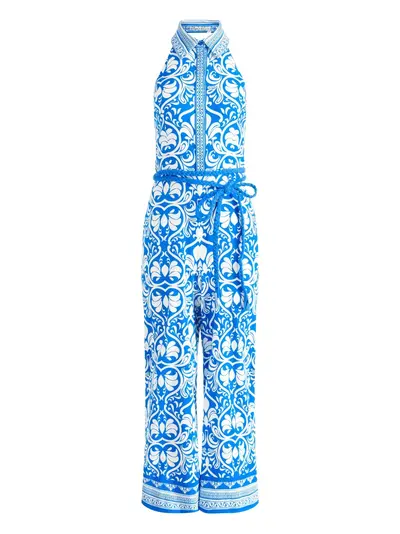 blue all-over floral print fitted bodice self-tie belt wide-leg silhouette collar detail