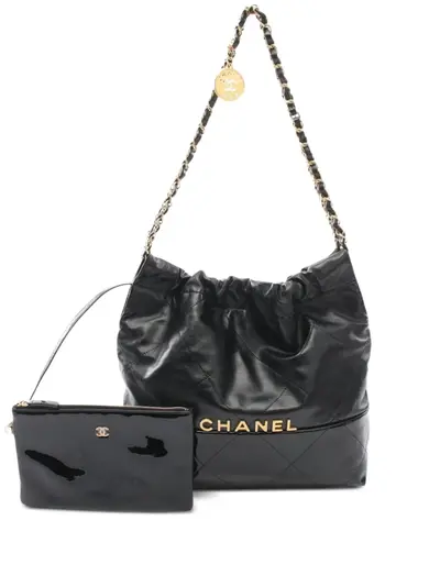 circa 2021 black calf leather patent finish diamond quilting gold-tone logo lettering two leather and chain-link shoulder straps medallion pendant magnetic fastening main compartment internal zip-fastening pocket internal logo patch diamond-quilted lining removable pouch gold-tone hardware Serial Number: HP4565AL Condition: EXCELLENT. This previously owned item is in near-perfect condition with no signs of damage or use.