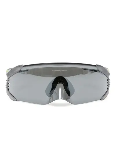 grey mirrored lenses logo detailing shield frame These glasses come with a protective case.