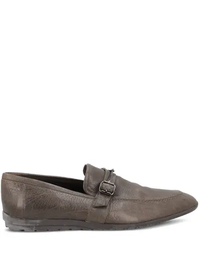 olive green leather smooth grain decorative buckle detail almond toe slip-on style branded leather insole flat rubber sole Condition: GOOD. This previously owned and used item is in good condition with minimal signs of use. This may include fading of material or plating and scratches.