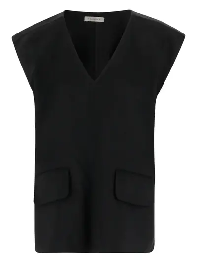 black v-neckline cap sleeves front patch pockets