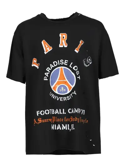 black front print design 'paris' and 'university' lettering football camp motif distressed detailing