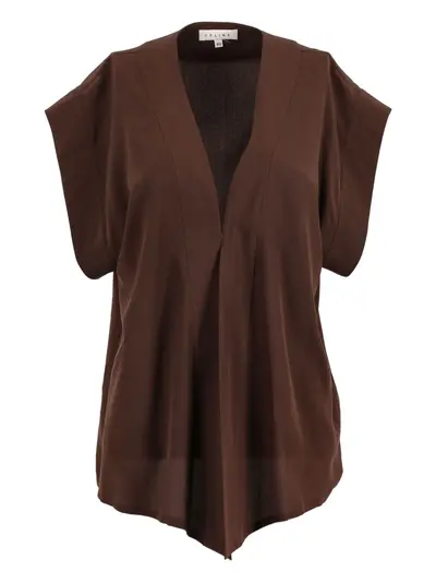 brown silk open front V-neck short sleeves Condition: GOOD. This previously owned and used item is in good condition with minimal signs of use. This may include fading of material or plating and scratches.