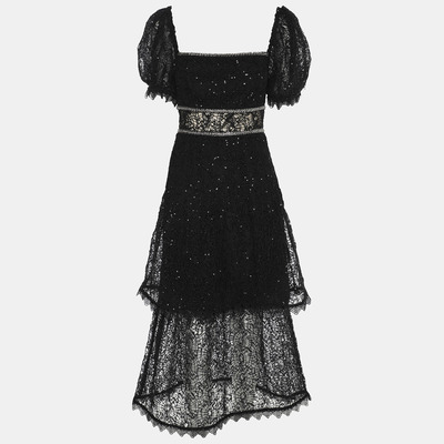 Self Portrait’s black midi dress is crafted in sequin embellished circle lace with a fit and flare silhouette. Feminine, polished, and full of texture, it’s ideal for evening events where understated glamour is key. Pair with statement earrings and heels for a classic finish.