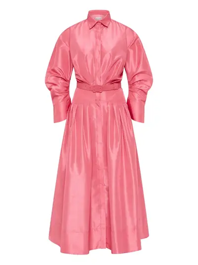 bright pink collared neckline long balloon sleeves front button closure pleated skirt matching belt adorned