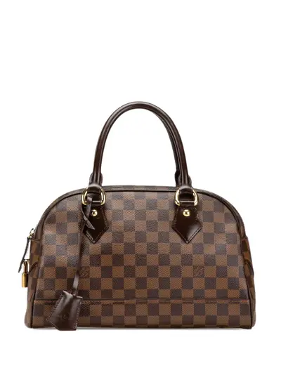 damier ebene canvas body with leather trim rolled leather handles clochette top zip closure interior slip pockets brown Serial Number: CA1028 Inclusions: padlock, key. Condition: GOOD. This previously owned and used item is in good condition with minimal signs of use. This may include fading of material or plating and scratches. Please refer to the photos on this product page for a detailed view of the item, including any damages declared.