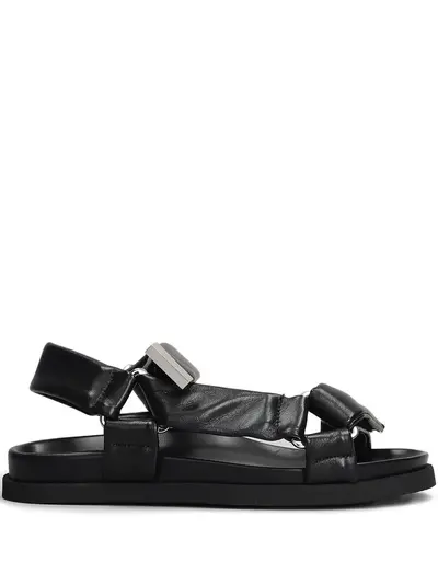 black touch-strap design silver-tone hardware accents cushioned footbed rubber sole