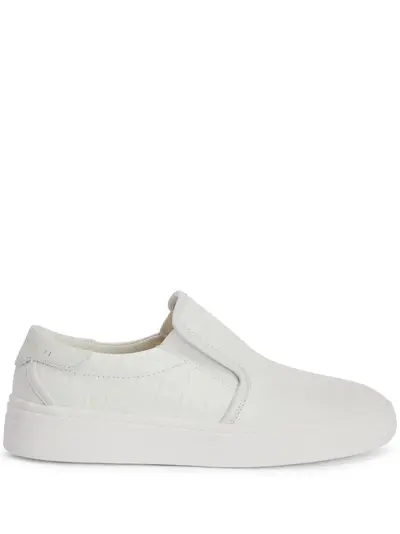 white leather embossed crocodile effect round toe slip-on style branded heel counter branded insole flat rubber sole