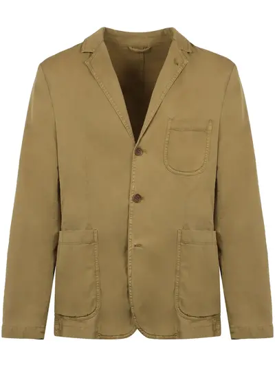 tobacco brown linen-cotton blend stretch-design front button fastening notched lapels long sleeves chest patch pocket two side patch pockets central rear vent straight hem unlined